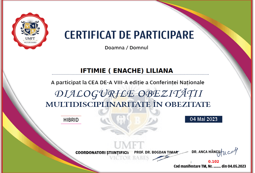 Alături de mine vei obține rezultate pe termen lung. Experiența dobândită într-un spital de stat, unde, cu toată dragostea și dedicarea activez și astăzi, mi-a permis să pot lucra cazuri dificile, de la obezitate grad III, la tulburări alimentare și copii mici, sau controlul afecțiunilor cronice (diabet zaharat, boli cardiovasculare, boli digestive, diferite cancere, afecțiuni la nivelul ficatului, rinichilor etc.). Am implementat soluții personalizate pentru orice stil de viață și m-am axat pe rezultate pe termen lung, astfel încât nu îți pui viața pe pauză pentru o dietă, ci înveţi să gestionezi lucrurile diferit.